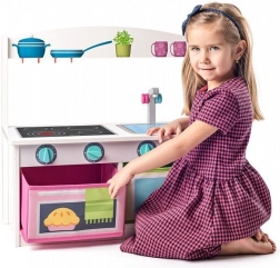 Cette cuisine et banc 2-en-1 en bois multifonction offrent des heures d’amusement et un usage pratique en un seul produit. La cuisine est équipée d’un réchaud avec boutons rotatifs, d’un évier avec robinet et de compartiments de rangement rappelant un four et un micro-ondes. Grâce à sa construction stable, elle convient au jeu quotidien comme à l’assise.
