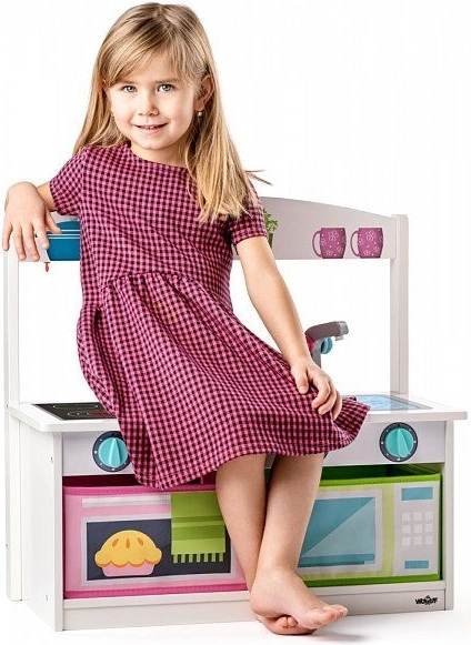 En mode cuisine, les enfants imitent les adultes, apprennent les bases des tâches culinaires et développent leur imagination. Transformée en banc, vous obtenez une assise pratique pour se reposer. Dimensions compactes 59 × 58 × 31,5 cm pour gagner de la place, un excellent choix pour les petites chambres.