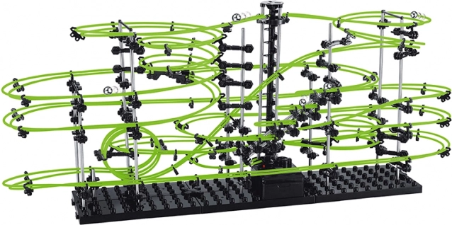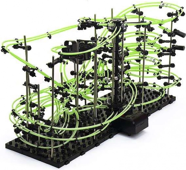 Une fois assemblée, observez les billes métalliques dévaler la piste puis revenir via l’ascenseur spiralé au point de départ. Dans l’obscurité, la piste s’illumine, rendant chaque passage impressionnant. Montrez à votre famille et à vos amis les principes physiques de base – vitesse, gravité et force centrifuge – en action.
