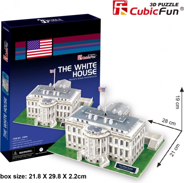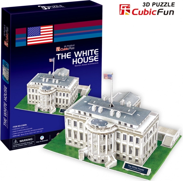 Construisez l’emblématique Maison Blanche sous forme de puzzle 3D réaliste de CUBICFUN. 64 pièces en mousse rigide avec stratifié imprimé, faciles à assembler sans colle ni ciseaux. Difficulté 4/7, temps de construction 150–180 minutes. Un excellent cadeau, un jeu éducatif et une décoration stylée.
