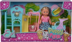 Evi s’occupe de 3 chiots sur une aire de jeu pour enfants avec une balançoire, y compris une poussette.