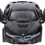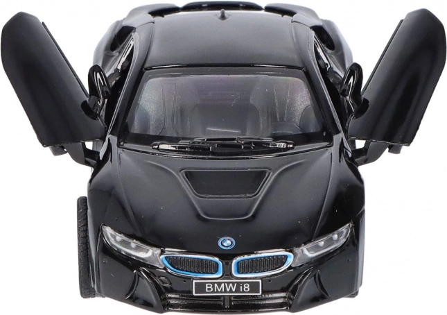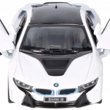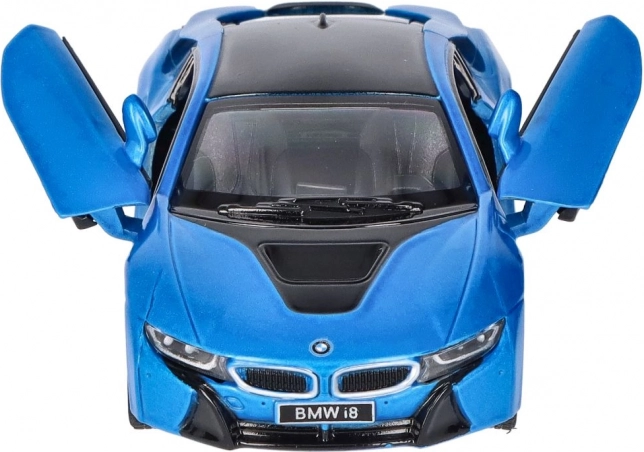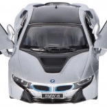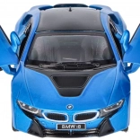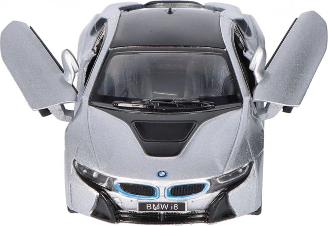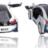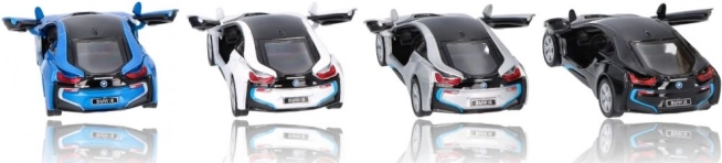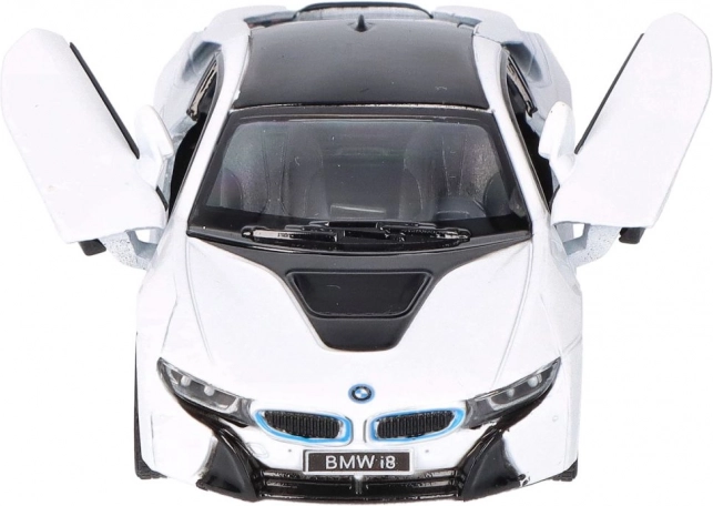 La réalisation détaillée du modèle métallique BMW i8 inclut des éléments de design précis, comme la calandre caractéristique BMW et la forme des phares.