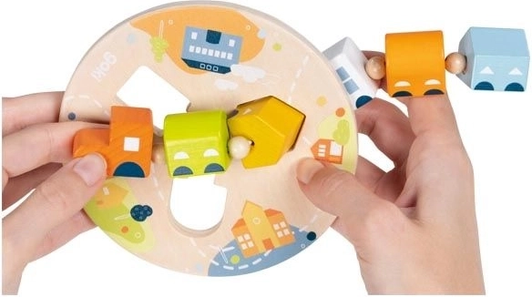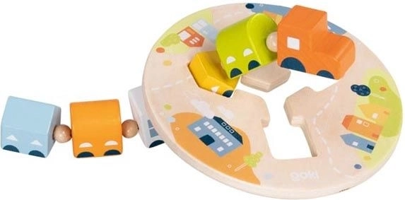 Ce train en bois de haute qualité de la marque GOKI est conçu comme un jeu de compétences ingénieux pour développer les capacités des enfants. La locomotive et ses cinq wagons de formes différentes traversent une base à enfiler et ne poursuivent leur route que lorsque les wagons sont placés au bon endroit. Les enfants apprennent ainsi naturellement la logique et la coordination œil–main.