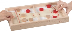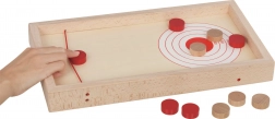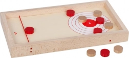 Ce jeu en bois réversible offre deux expériences ludiques dans une seule boîte. En mode Super Puck, deux joueurs tentent de propulser leurs palets le plus vite possible à travers l’ouverture vers le camp adverse à l’aide d’élastiques. Faites pivoter la planche pour obtenir un jeu plus calme mais palpitant axé sur la précision et le comptage des points en visant des cibles.