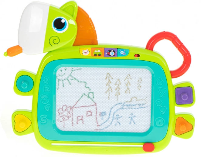 La tablette magnétique HOLA est un excellent choix pour développer la créativité et la motricité fine. Grâce à ses quatre zones colorées, les dessins prennent des couleurs qui plaisent aux enfants. D’un seul mouvement du curseur, la surface s’efface et est prête pour de nouvelles idées. La forme de petit cheval avec une crinière lumineuse et des sons joyeux motive les enfants à jouer.