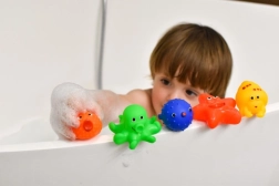 REMARQUE : Pour garder le jouet propre, après chaque jeu dans l’eau, pressez l’eau hors de l’intérieur et placez le jouet dans un endroit sec afin que les résidus d’eau s’évaporent. Après quelques mois d’utilisations fréquentes au bain, nous recommandons de remplacer le jouet.