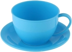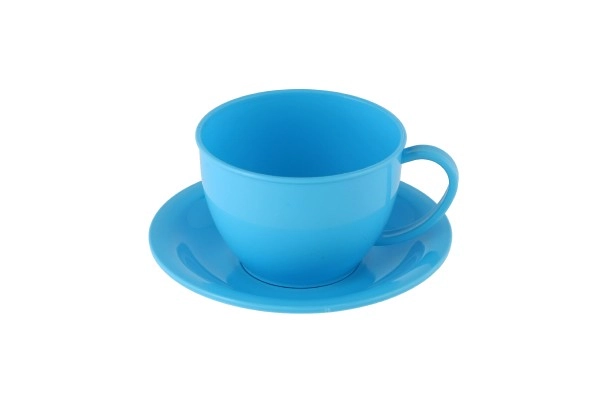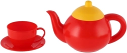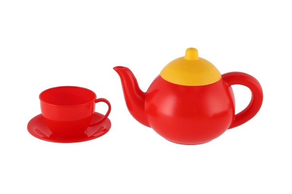Une bouilloire rouge et quatre tasses colorées avec soucoupes permettent de préparer et de « servir » le thé à toute la famille ou aux amis.