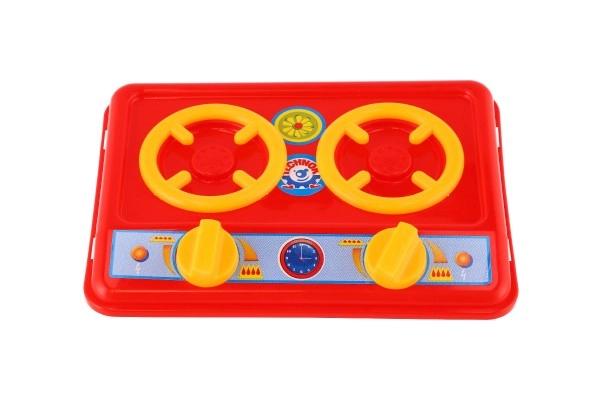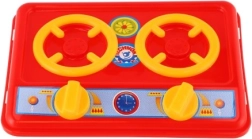 Cuisinière rouge à deux plaques avec boutons rotatifs qui stimule l’imagination et initie les enfants aux bases de la cuisine en toute sécurité.