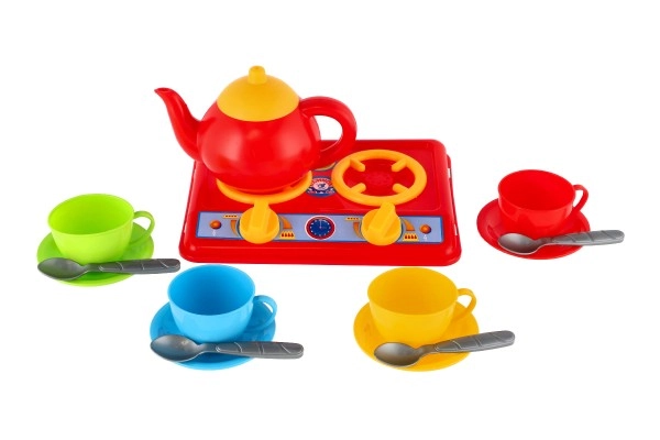 Cuisinière, bouilloire, 4 tasses, 4 soucoupes, 4 cuillères