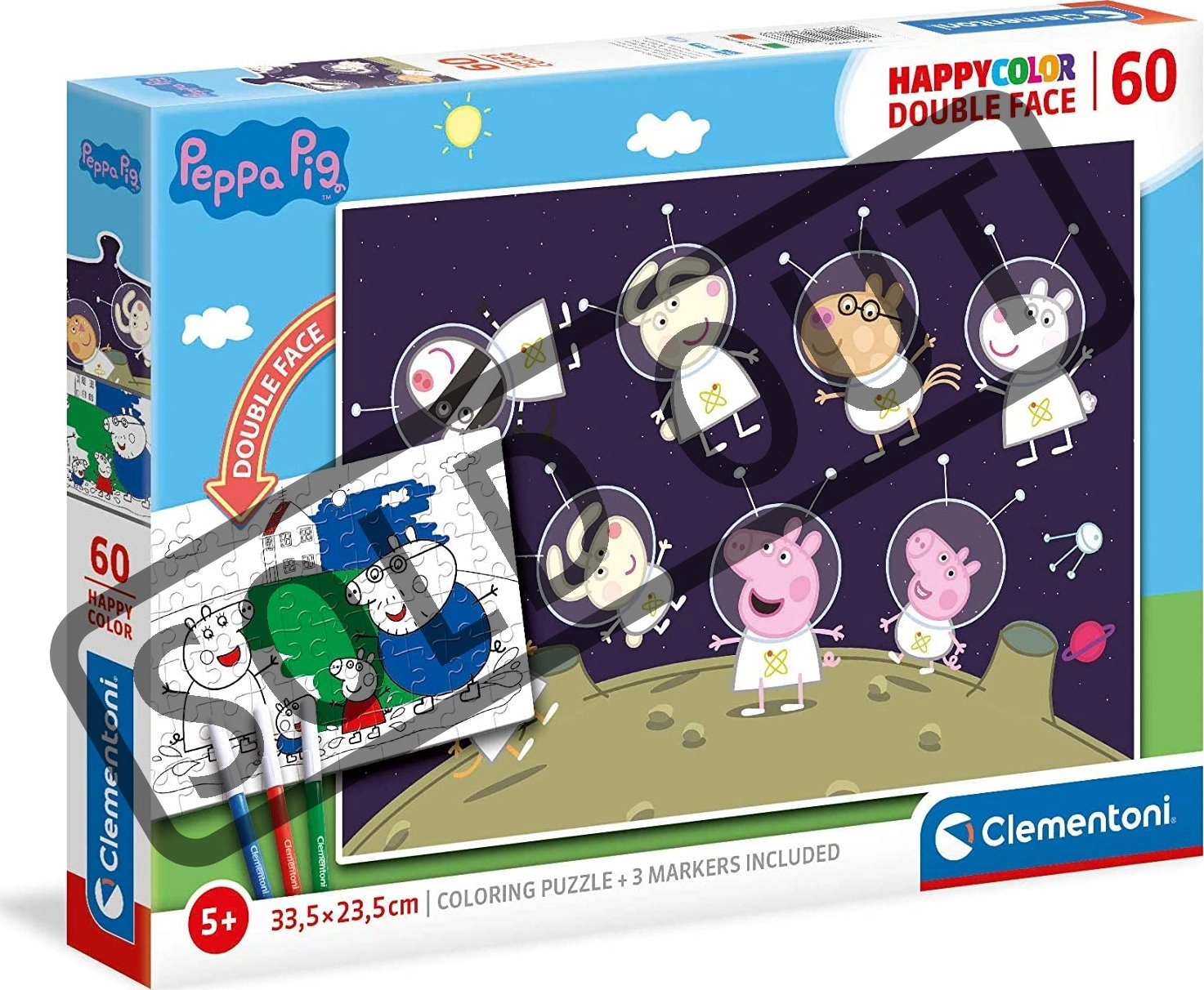 Profitez d’un loisir créatif avec le puzzle recto-verso Peppa Pig dans l’espace. Une face propose un motif coloré classique à assembler, l’autre est un coloriage en noir et blanc que les enfants peuvent remplir selon leur imagination. Idéal comme cadeau pour les petits fans de Peppa et des aventures spatiales.