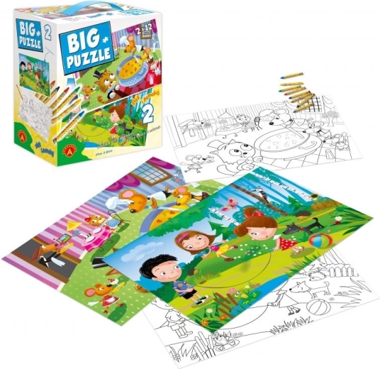 Découvrez le kit créatif de deux puzzles double face ALEXANDER, qui allie divertissement et apprentissage. Chaque puzzle possède de grandes pièces pour les petites mains (12 pcs), un format de 67 × 47 cm et propose d’un côté un motif coloré, et de l’autre une image en noir et blanc à colorier. Un set de crayons de couleur est inclus pour créer immédiatement. Idéal pour le développement de la motricité, de la logique et de la créativité des enfants dès 3 ans.