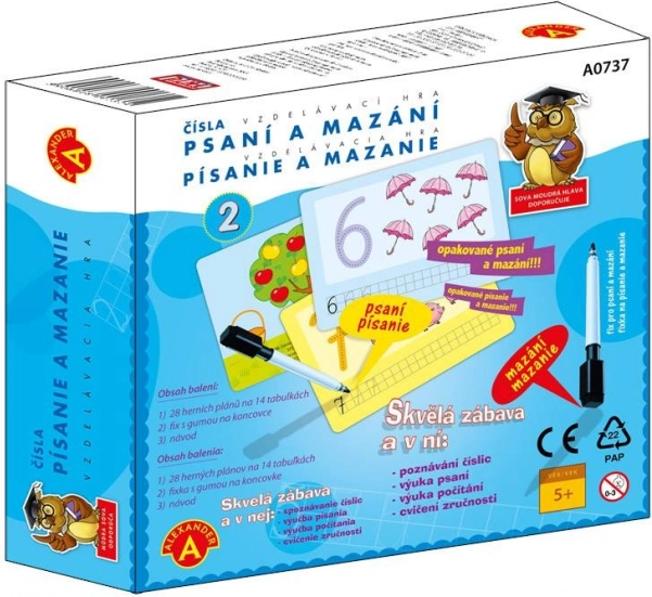 14 fiches recto verso (28 motifs), feutre effaçable avec éponge, mode d’emploi en tchèque et en slovaque