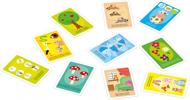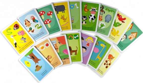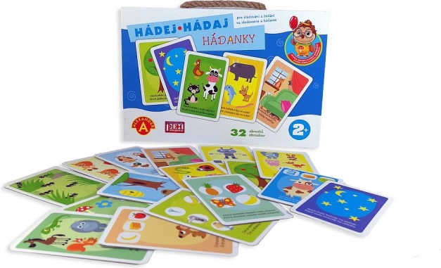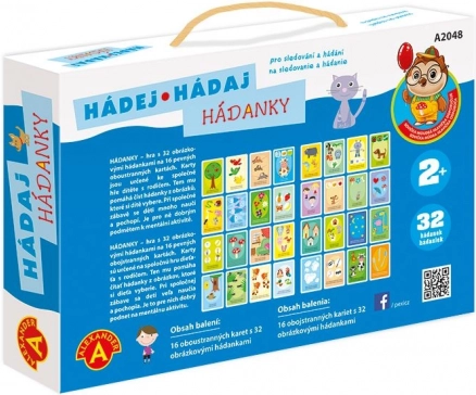 - 16 grandes cartes colorées (32 devinettes illustrées), notice en tchèque et en slovaque, boîte rigide avec poignée