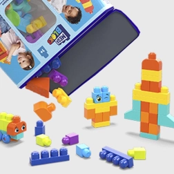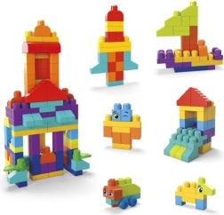 Le coffret contient 150 grands blocs, dont des éléments spéciaux : une base à roues pour véhicules, des blocs avec de petits yeux pour des personnages ludiques, des feuilles pour des thèmes nature et des éléments de toit pour les constructions. Le tout est entièrement compatible avec les autres sets MEGA BLOKS, permettant d’étendre librement la collection.