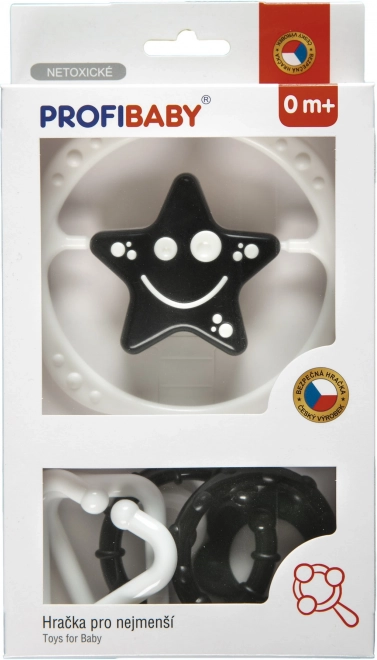 Pratique, l’ensemble de hochets noir et blanc pour bébé combine une chaîne pour poussette et un hochet séparé en forme d’étoile ou de fleur. Les couleurs contrastées stimulent la perception visuelle, tandis que le son doux et les formes sûres développent la motricité et les sens de l’enfant. Les hochets sont conçus pour une prise en main confortable et répondent à des normes d’hygiène strictes. Sans arêtes vives, sans petites pièces détachables et idéal pour jouer au quotidien à la maison comme en déplacement.