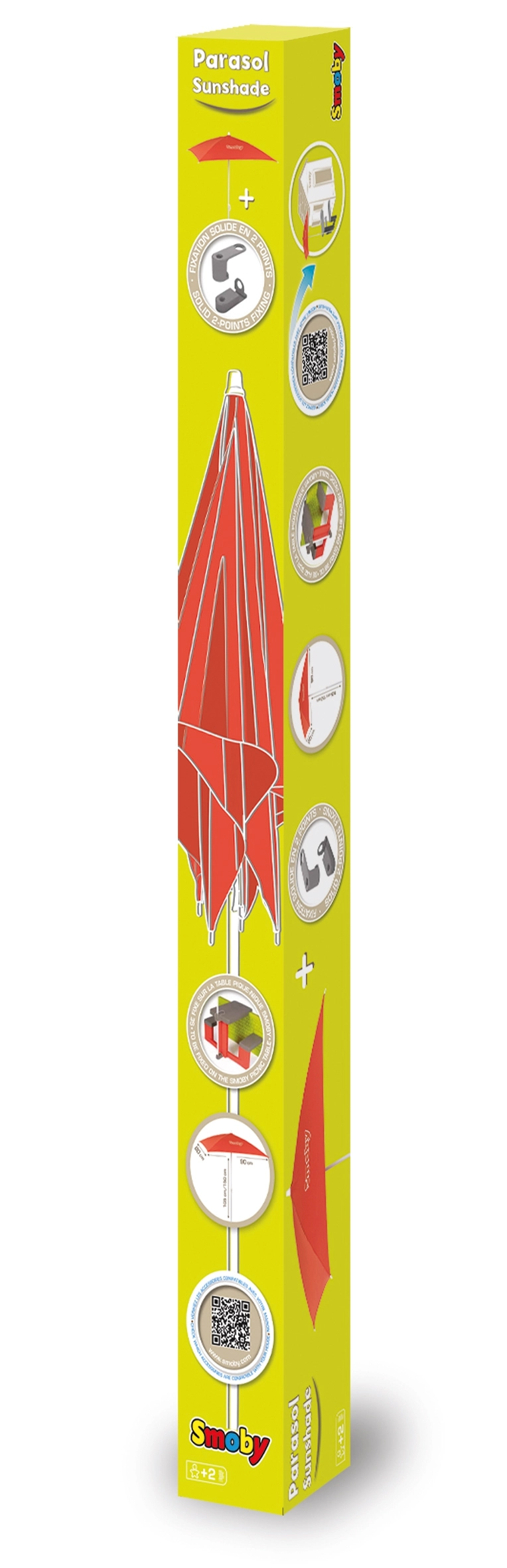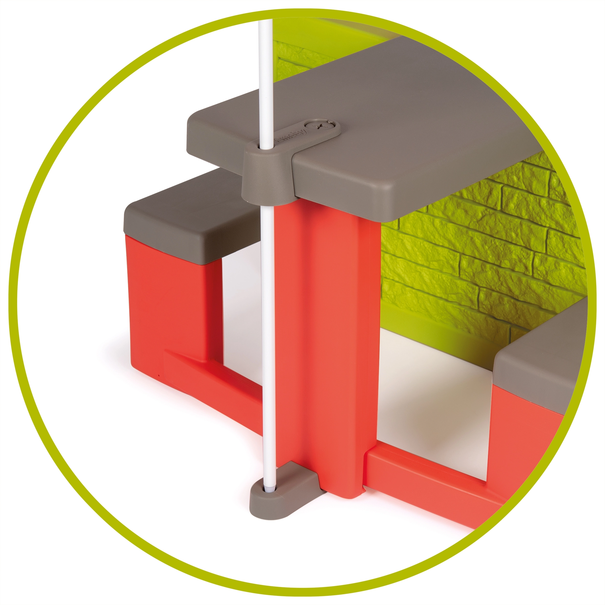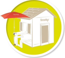 Parasol pour se protéger du soleil et de la pluie, fixé à la table de jardin SMOBY cottage.