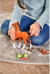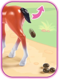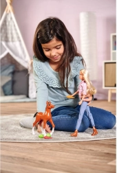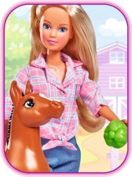 La poupée Steffi accompagnée d’un adorable poney doté d’une fonction amusante. Lorsque l’on déplace la queue sur le côté, le poney fait ses besoins. L’ensemble comprend des accessoires pour prendre soin du poney.