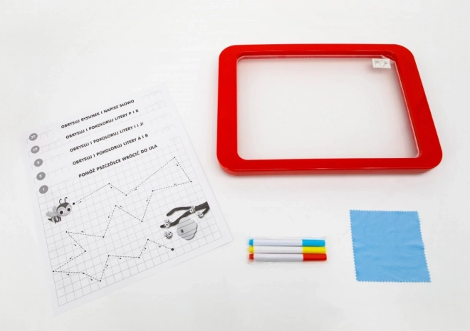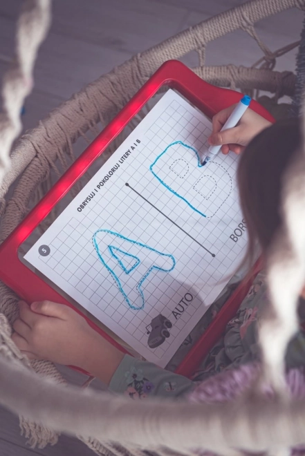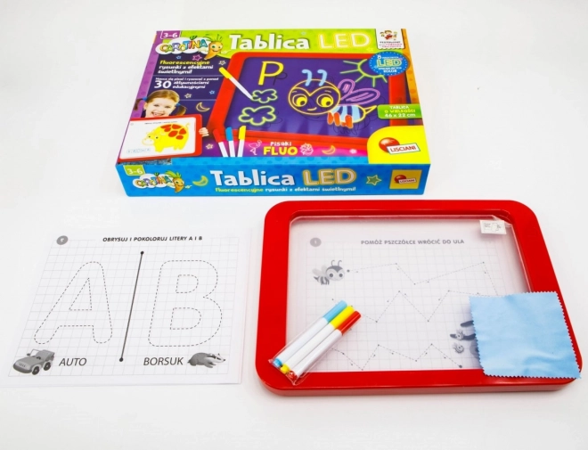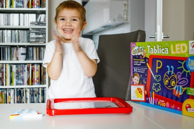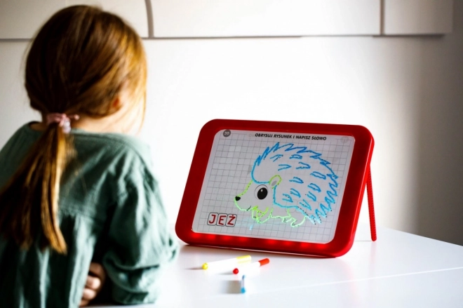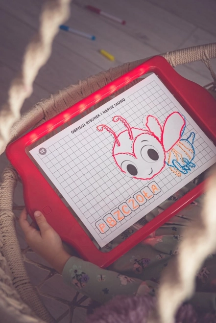 Le tableau LED Carotina est un outil éducatif idéal pour les enfants. Il propose un programme éducatif basé sur 30 cartes d'apprentissage pouvant être utilisées par la méthode programmée du tracé. Il suffit de placer la carte sur la base en papier et de l'insérer sous l'écran transparent du tableau. Le dessin s'effectue à l'aide de trois marqueurs fluorescents inclus dans le set. Grâce à ces marqueurs, les enfants peuvent dessiner à plusieurs reprises et effacer leurs dessins avec un chiffon sec. Le tableau LED est polyvalent comme une ardoise classique et brille presque comme une enseigne au néon !