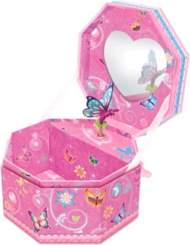 Cette élégante boîte à bijoux octogonale au motif de papillons est l’endroit idéal pour ranger bagues, boucles d’oreilles et autres trésors. À l’ouverture, une douce mélodie classique retentit et une figurine se met à danser, créant une atmosphère féerique.