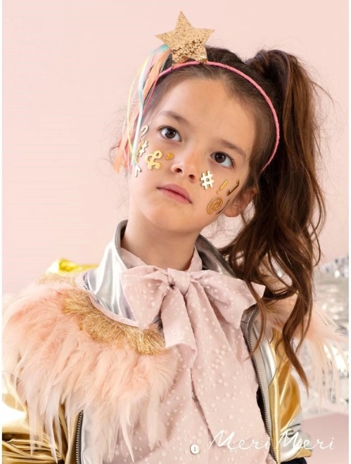 Bandeau Étoile Filante est un bandeau élastique avec un revêtement textile et une étoile scintillante avec des rubans colorés, apprécié par les petits et les grands.