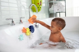 Transformez le bain en petit laboratoire ! Les engrenages colorés avec ventouses se fixent facilement sur une surface lisse de la baignoire ou du carrelage. Lorsque vous faites couler de l’eau dessus, ils se mettent à tourner et forment ensemble un système aquatique interactif qui encourage les enfants à explorer et à expérimenter.