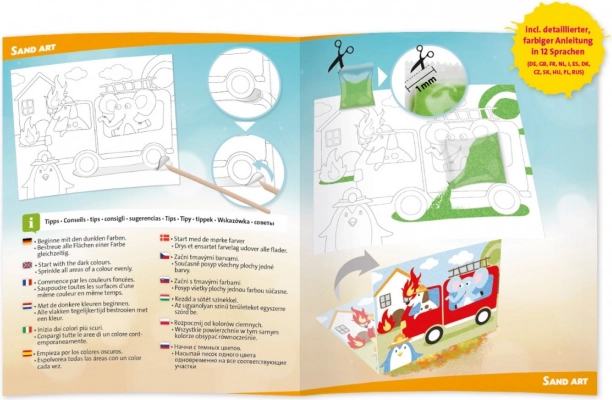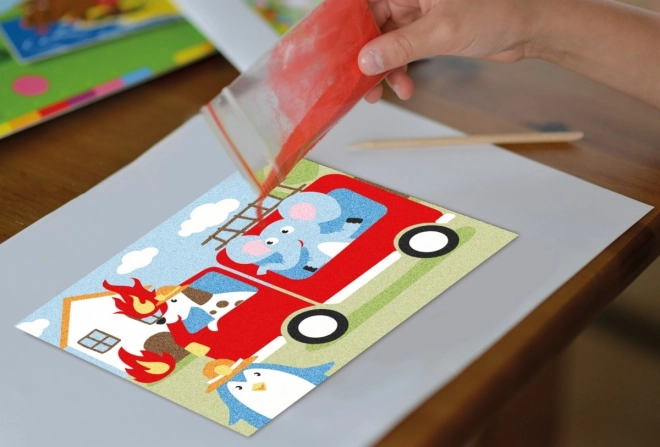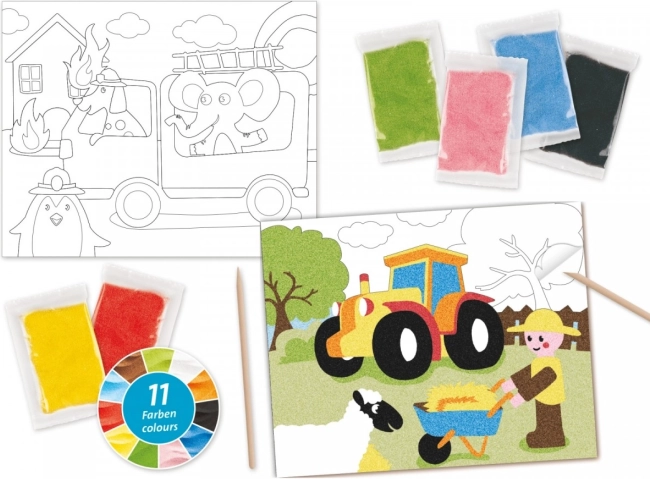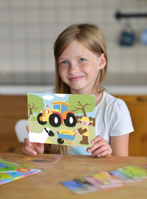 Ce kit créatif de sable est un excellent choix pour les petits artistes dès 6 ans. Il suffit de décoller progressivement les parties du motif et de saupoudrer de sable coloré – les couleurs adhèrent à la surface autocollante et créent une image nette et lumineuse. Le set propose deux motifs appréciés : un tracteur et un camion de pompiers.