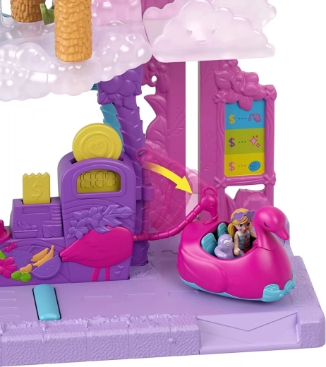 Sur le “ralentisseur”, des éléments de la station-service apparaissent avec un tuyau en forme de flamant rose – prêts, faites le plein et c’est reparti ! La poupée et un ami animal (toucan ou paresseux) peuvent monter dans la voiture. Le set est compatible avec la plupart des véhicules POLLY POCKET et offre des heures de jeu imaginatif avec des éléments aquatiques.