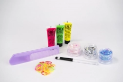 - 3 gels colorants pour cheveux, 3 paillettes en poudre, élastiques, pinceau, peigne