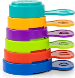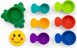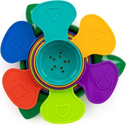 Jouet empilable pour le bain Flower de Milly Mally. 6 gobelets colorés à empiler, à assembler en tour, ou à utiliser comme moules à sable. Chacun possède des trous au fond pour verser l’eau, tamiser le sable pour jouer, au terrain de jeux ou à la plage. Les couleurs et les formes en relief sur les gobelets aident à l’apprentissage.