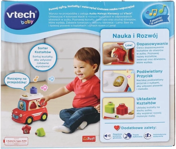 La petite voiture interactive VTech est un excellent moyen de développer les aptitudes des enfants en jouant. Elle parle en polonais, enseigne les formes, les chiffres et les noms des animaux ainsi que leurs sons, et grâce à ses effets lumineux et sonores, elle capte l’attention des enfants. Quatre roues en plastique pivotantes assurent un déplacement fluide pendant le jeu.
