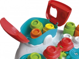 La table propose un large éventail d'activités pour développer les compétences motrices des enfants, telles que des engrenages, un catapulte à cubes et des bulles éclatantes.