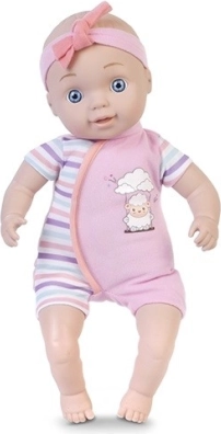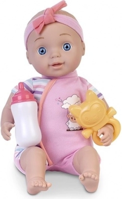 Adorable poupon 33 cm qui ravira chaque enfant avec des sons réalistes et de nombreux accessoires. En appuyant sur le ventre, il dit « maman », « papa », pleure et rit. Sont inclus biberon, anneau de dentition, doudou et boîtes avec reliefs détaillés. La poupée porte un pyjama tout doux et un serre-tête à nœud – idéal pour jouer à prendre soin de bébé.