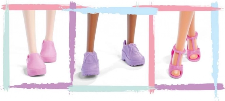 Des baskets ou sandales roses et violettes apportent du peps à chaque tenue et soulignent le style mode de la poupée.