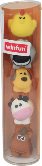 Adorable ensemble de cinq jouets de bain avec des animaux de la ferme – chien, vache, poussin, cheval et mouton. Grâce au plastique souple et aux formes arrondies, ils sont idéaux pour une prise en main facile par les petites mains et offrent des heures de diversion dans le bain, à la maison comme en voyage. Ils stimulent l’imagination et la motricité fine.