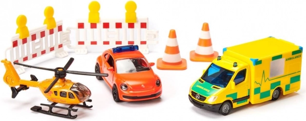 - Ambulance (fourgon), voiture de secours, hélicoptère de sauvetage, 2× cône, 2× barrière