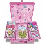 Coffret cadeau Pecoware stylé dans une boîte décorative au motif licornes, comprenant 2 compartiments dépliables et un espace caché pour le journal.