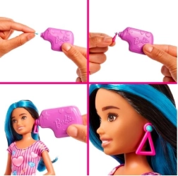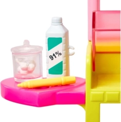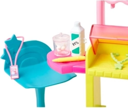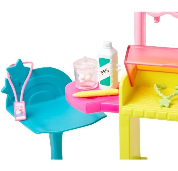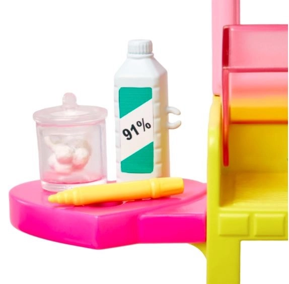 Le poste de perçage d’oreilles propose un espace pour présenter les boucles d’oreilles, ranger les accessoires de la poupée et un fauteuil pour les clients. Parmi les autres accessoires figurent une solution désinfectante, des cotons, un badge d’employée, un marqueur d’oreille et 2 colliers pour enrichir le jeu. Cette transformation unique peut être répétée à l’infini, faisant de ce set avec la poupée Skipper un cadeau idéal pour les enfants dès 3 ans.