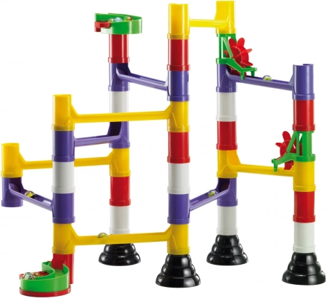 Les tubes, colonnes et rails modulaires s’emboîtent parfaitement. Les enfants comprennent vite la logique de construction et peuvent modifier sans cesse le parcours des billes.
