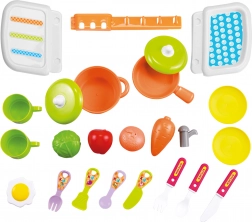 Elle comprend de nombreux accessoires qui imitent de véritables ustensiles de cuisine. Les enfants peuvent « cuisiner », servir et ranger, ce qui favorise l’autonomie et la créativité.