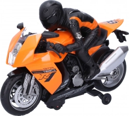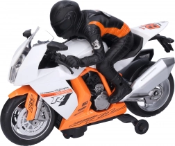 La moto a une taille idéale de 28 cm pour une prise en main et une manipulation aisées. Deux variantes de couleurs sont disponibles – orange et blanc, qui ressortent parfaitement dans toute collection. L’alimentation est assurée par 4× piles AA (non incluses).