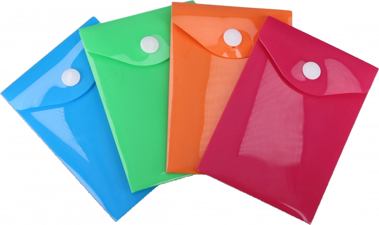 Pochette pratique avec bouton-pression de 11,5 × 8 cm pour garder en ordre petits documents et fournitures scolaires ou de bureau. Fabriquée en plastique souple, facile à nettoyer et, grâce à son fermeture à bouton-pression, elle protège son contenu contre les chutes et la saleté.