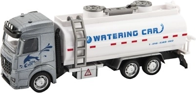 Modèle de camion-citerne avec cabine grise et réservoir blanc, offrant la possibilité de jeux à thème avec des éléments aquatiques.