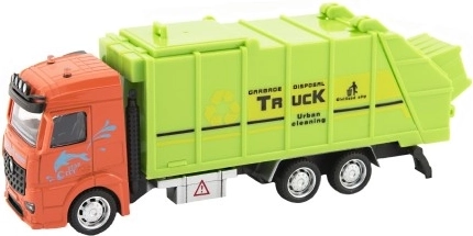 Ce camion benne avec cabine orange et corps vert apporte des éléments de maintenance urbaine dans le jeu.