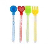 Quatre formes de poignées différentes: cercle, cœur, carré et fourchette, en couleurs bleu, rouge, vert et jaune.