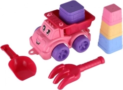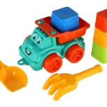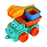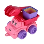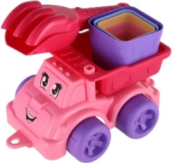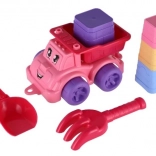Petite voiture en plastique colorée avec une expression joyeuse, parfaite pour transporter le sable et stimuler l'imagination des enfants.