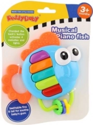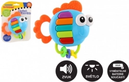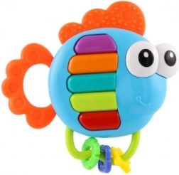 Hochet musical et anneau de dentition en forme de poisson pour les tout-petits dès 3 mois. En appuyant sur les touches, il joue des mélodies et des notes individuelles, et les touches s’illuminent. En plastique pour un nettoyage facile, avec piles incluses et verrou de sécurité.