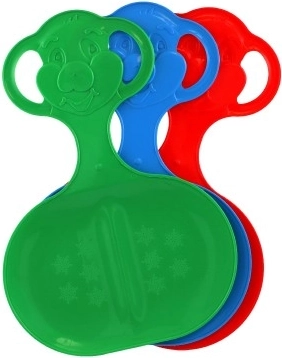 La luge est disponible en trois couleurs : vert, bleu et rouge. Chaque couleur comporte un design ludique avec un sourire sur la poignée.