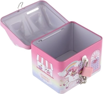 La tirelire est décorée d'un motif de licorne et d'arc-en-ciel, ce qui en fait non seulement un article pratique mais aussi un bel accessoire pour la chambre des enfants.