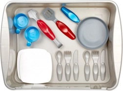 Le set comprend 13 pièces d’accessoires (assiettes, tasses, couverts, casserole, poêle, etc.), qui favorisent l’autonomie, la coordination œil–main et les compétences sociales lors des jeux avec des amis.