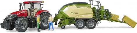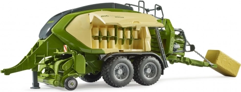 Grâce aux panneaux latéraux ouvrants, on peut admirer les mécanismes reproduits avec réalisme et accéder facilement aux « interventions de service ». Le capot supérieur permet l’insertion des balles, tandis que la béquille amovible et le châssis robuste garantissent la stabilité en « fonctionnement » comme au stationnement. Le modèle est largement compatible avec les tracteurs BRUDER des séries 20xx, 21xx, 30xx, 31xx et 40xx, s’intégrant ainsi parfaitement à tout ensemble de ferme.